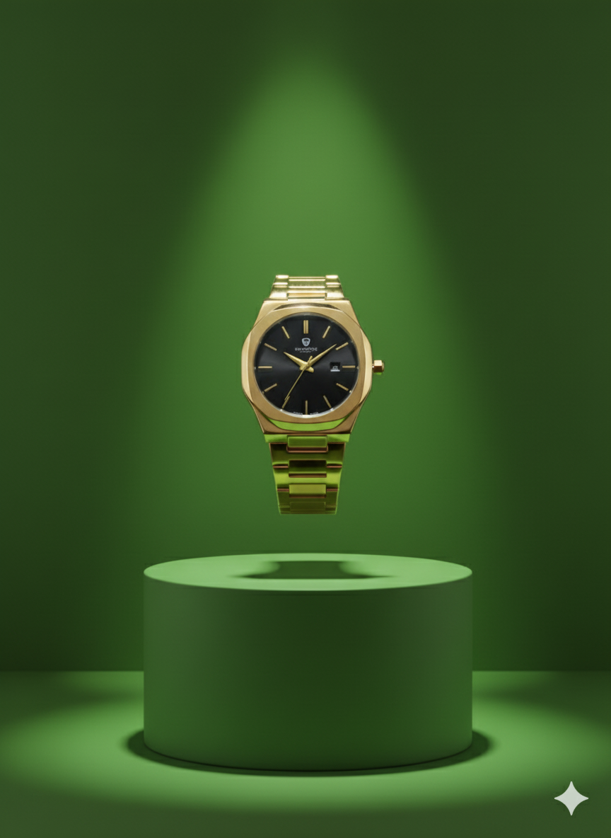 “Black Gold Aura – a bold men’s watch that fuses deep black tones with luxurious gold accents, exuding sophistication and modern elegance for every occasion.”